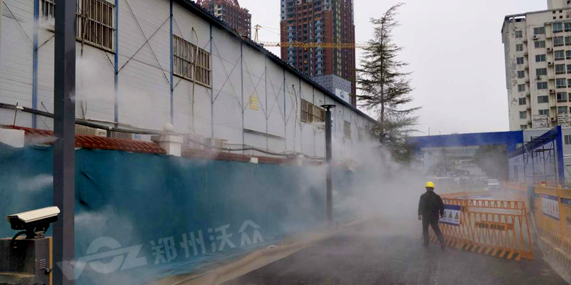 項目位于鄭州二七區(qū)某工作,在工地的道路兩側(cè),安裝高4米的燈桿,燈桿內(nèi)置高壓噴霧噴頭和管路系統(tǒng),高壓微霧主機(jī)工作將高壓水輸送過去,燈桿內(nèi)置噴頭就會噴出10微米的水霧,有效的抑制工地道路上的揚(yáng)塵。