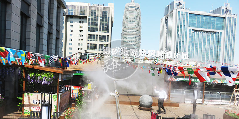夏季來(lái)臨,在鄭州東區(qū)大河錦悅酒店七樓露天燒烤區(qū)做的霧森造景降溫項(xiàng)目完工。