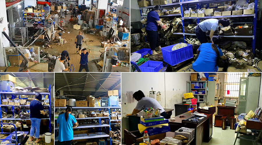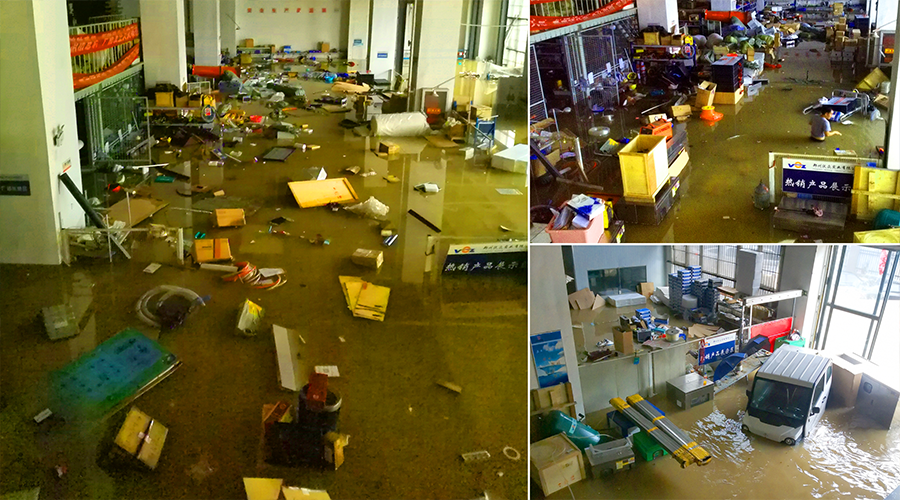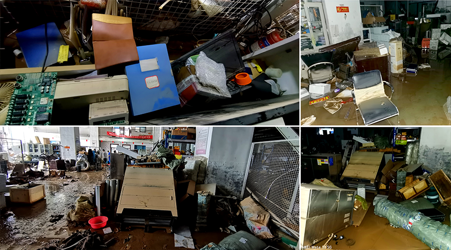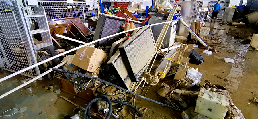 在積水沖擊下,沃眾廠房的產(chǎn)品零部件等物品被積水沖擊,散落各處。