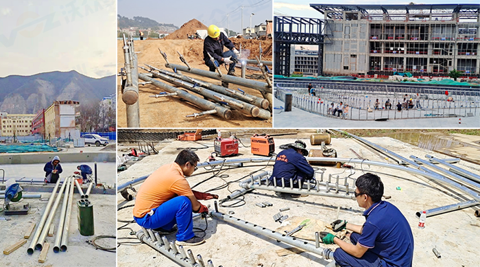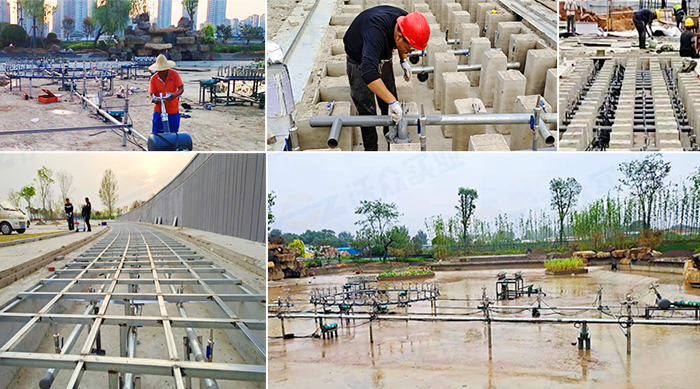 之后,進(jìn)行管道安裝,電氣配線,電機(jī)水泵、燈光、噴頭、控制系統(tǒng)等設(shè)備安裝。